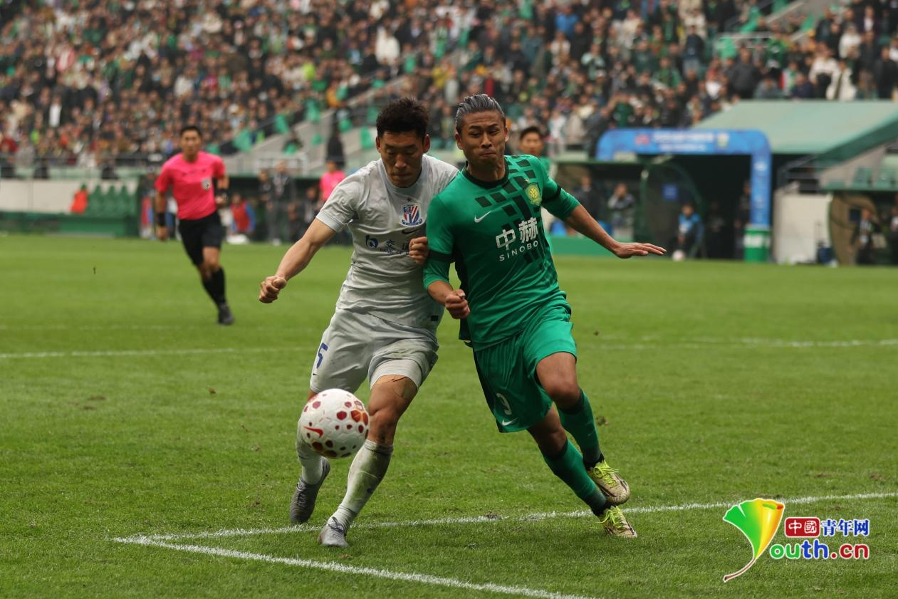 3月21日下午,北京工人体育场,北京国安队在2026赛季中超联赛第三轮主场迎战上海申花队。图为北京国安队球员张玉宁正在奋力拼抢球权。 记者 杨逸凡/摄