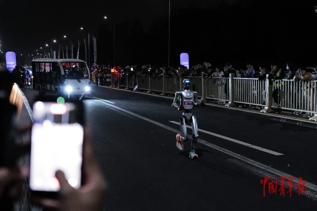 4月11日深夜,北京经济技术开发区,2026人形机器人半程马拉松全流程全要素测试活动,机器人正在做测试。据介绍,2026人形机器人半程马拉松将于4月19日上午在北京亦庄鸣枪开跑。为更好筹备赛事,4月11日晚至12日凌晨,主办方组织开展了2026人形机器人半程马拉松全流程全要素测试活动,全面模拟赛道通行、流程调度、设备协同、应急保障等核心场景。报名赛队中,70余支队伍参加此次测试,其中包含4支国际赛队。自主导航赛队和遥控赛队同场夜测。中青报·中青网记者 赵迪/摄