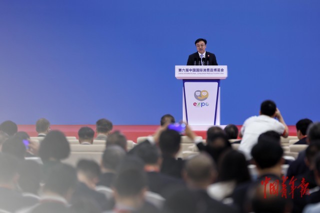 4月13日,海南海口,第六届中国国际消费品博览会暨2026“购在中国”国际消费季启动仪式上,海南省委书记冯飞致辞。第六届中国国际消费品博览会(以下简称“消博会”)于4月13日至18日在海南省举办,主会场设置在海南国际会展中心,内设8大展馆,汇聚全球顶尖的新潮消费品。两个分展区分别为设在三亚市的国际游艇分展区和设在琼海市的国际健康消费分展区。作为亚太地区规模最大的消费精品展,第六届消博会有来自60多个国家和地区的超过3400个品牌参展,集中呈现绿色、健康、数字、智能等新型消费领域的精品、新品。中青报·中青网记者 曲俊燕/摄
