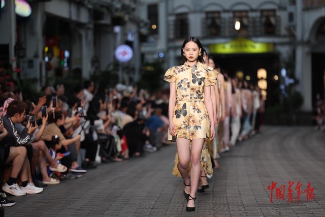 4月13日,海南海口骑楼老街,2026海南青年国际时装周秀场上,模特在走秀。海南青年国际时装周是由消博会时装周孵化而来的、扶持青年原创设计师品牌和新锐设计师品牌成长的时尚发布活动。4月12日至18日,2026海南青年国际时装周将在海口骑楼老街、自在湾、万象城三大特色秀场上演,呈现一场将南洋风情、滨海风光与都市潮流深度融合的全民时尚盛宴。中青报·中青网记者 曲俊燕/摄
