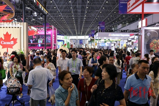 4月16日,海南海口,第六届消博会全球特色消费展区,熙熙攘攘的观展人群。当日,第六届消博会迎来首个公众开放日,全球特色消费、国货精品等展区人气高涨,美食、高端消费品等展位吸引了大量参观者亲身体验。不少参观者拖着购物车或野营车,全家老小齐出动,把全球精选好物带回家。公众开放日将持续至4月18日。中青报 中青网记者 曲俊燕/摄