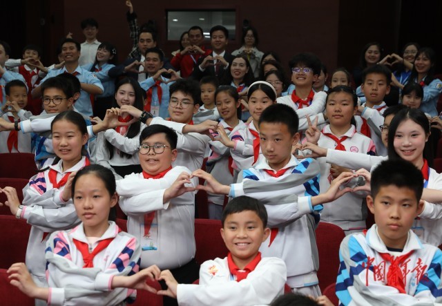 4月16日,北京市八一学校,中越两国少先队员代表一起手拉手“比心”合影留念。当日,中越少年“手拉手·心连心·共成长”主题队日活动在北京市八一学校举行。八一学校少先队员和少先队辅导员代表、越南青年来华“红色研学之旅”之“不忘初心”研学营少先队分团参加,并开展同上一堂科技课等活动。中青报·中青网记者 陈剑/摄