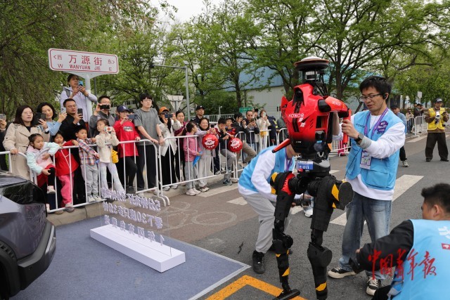 4月19日,北京经济技术开发区,2026北京亦庄人形机器人半程马拉松比赛上,来自雷霆闪电队的“闪电”在闪充补能站更换电池、冷却器件,吸引了人们的围观拍摄。当日,2026北京亦庄半程马拉松暨人形机器人半程马拉松举行,在人形机器人半程马拉松中,齐天大圣队、雷霆闪电队、星火燎原队分别以净用时50分26秒、50分56秒、53分01秒的成绩夺得冠军、亚军、季军,均打破56分42秒的人类半马世界纪录。中青报·中青网记者 陈思阳/摄