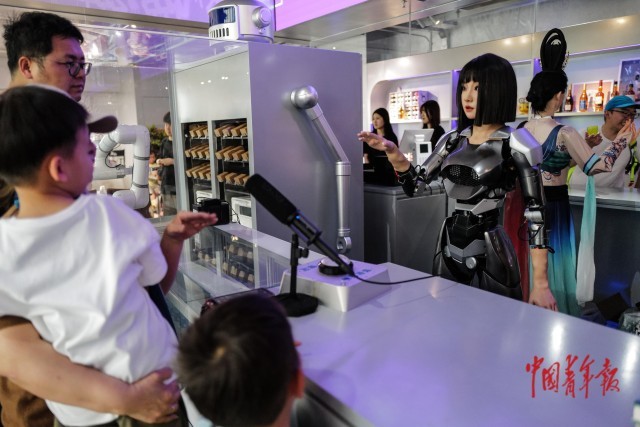 4月19日, 北京经济技术开发区,智能机器人主题2.0餐厅,前台机器人在和顾客互动。当天,2026北京亦庄半程马拉松暨人形机器人半程马拉松开赛,这里也开启试运营。据介绍,2.0餐厅从迎宾、后厨烹饪、餐食配送到餐后清理都由机器人提供全流程服务,致力于以“科技+餐饮+体验”的模式打造沉浸式机器人服务空间。中青报·中青网记者 赵迪/摄